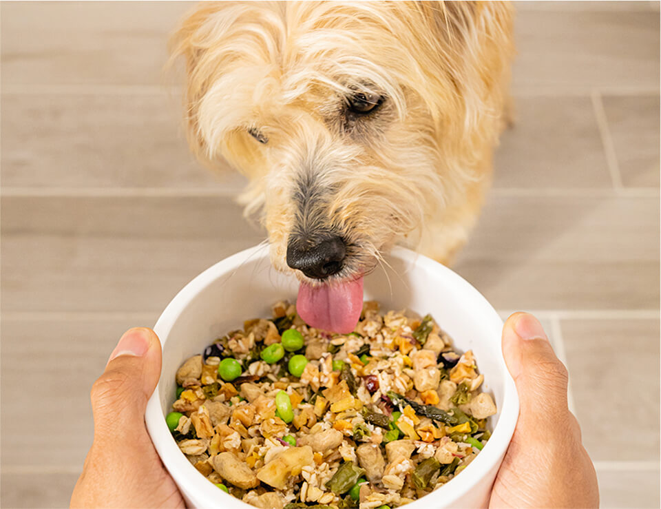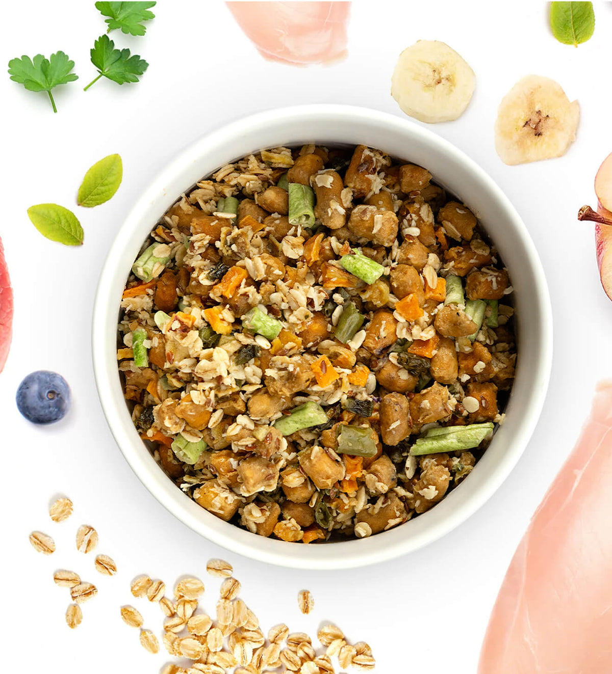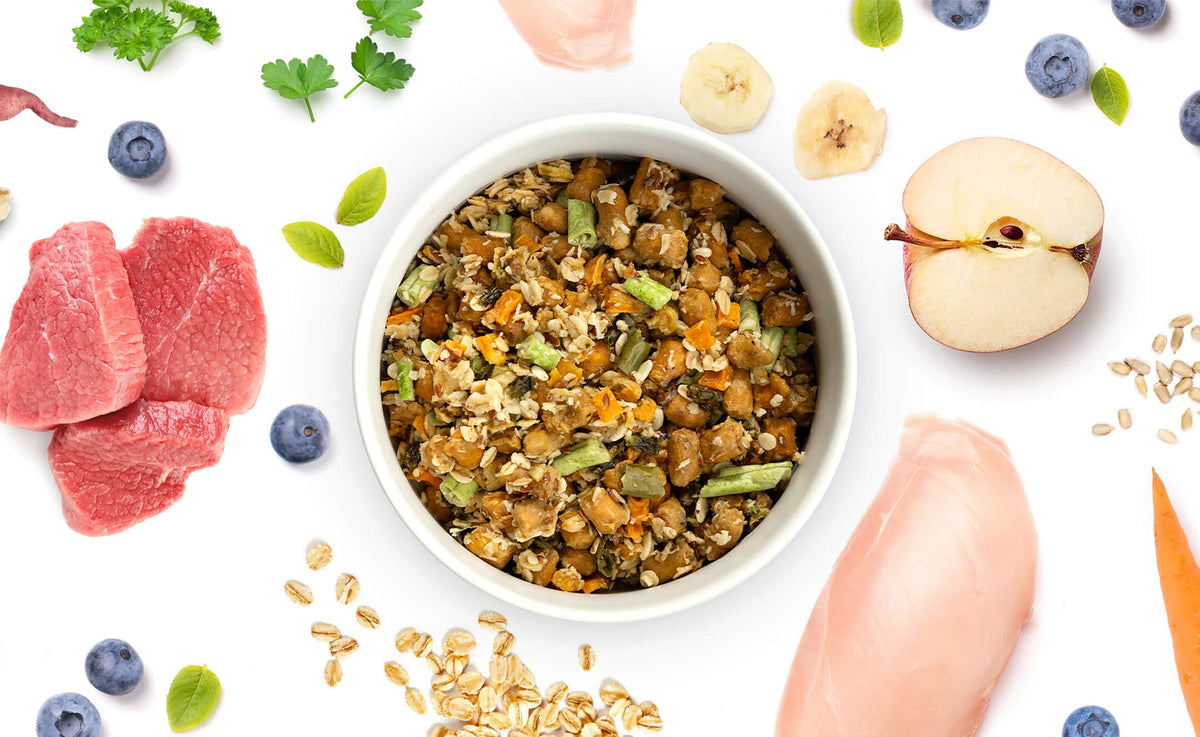 Freeze-dried raw proteins, veggies, fruits & nutritious grains.