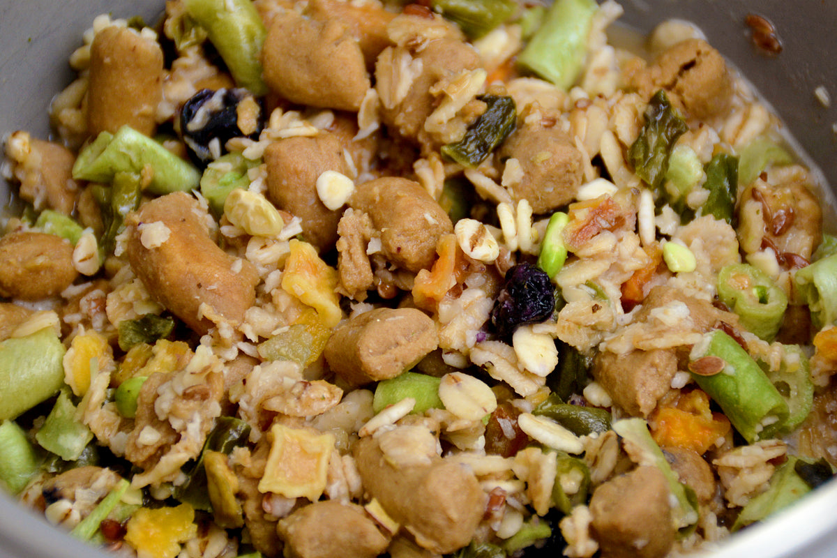 Ingredients: Chicken, sweet potato, oats, barley, chicken bone broth, green beans, flaxseed, coconut meal, eggs, sunflower oil (preserved with mixed tocopherols), natural flavor, bananas, marine microalgae oil, blueberries, dried chicory root, choline chloride, DL-methionine, calcium carbonate, L-threonine, salt, taurine, minerals (zinc proteinate, iron proteinate, copper proteinate, manganese proteinate, sodium selenite, calcium iodate), vitamins (vitamin A supplement, vitamin D supplement, vitamin E supplement, niacin, pantothenic acid, riboflavin, thiamine mononitrate, pyridoxine hydrochloride, folic acid, vitamin B12 supplement), potassium chloride, parsley, spearmint, rosemary extract.